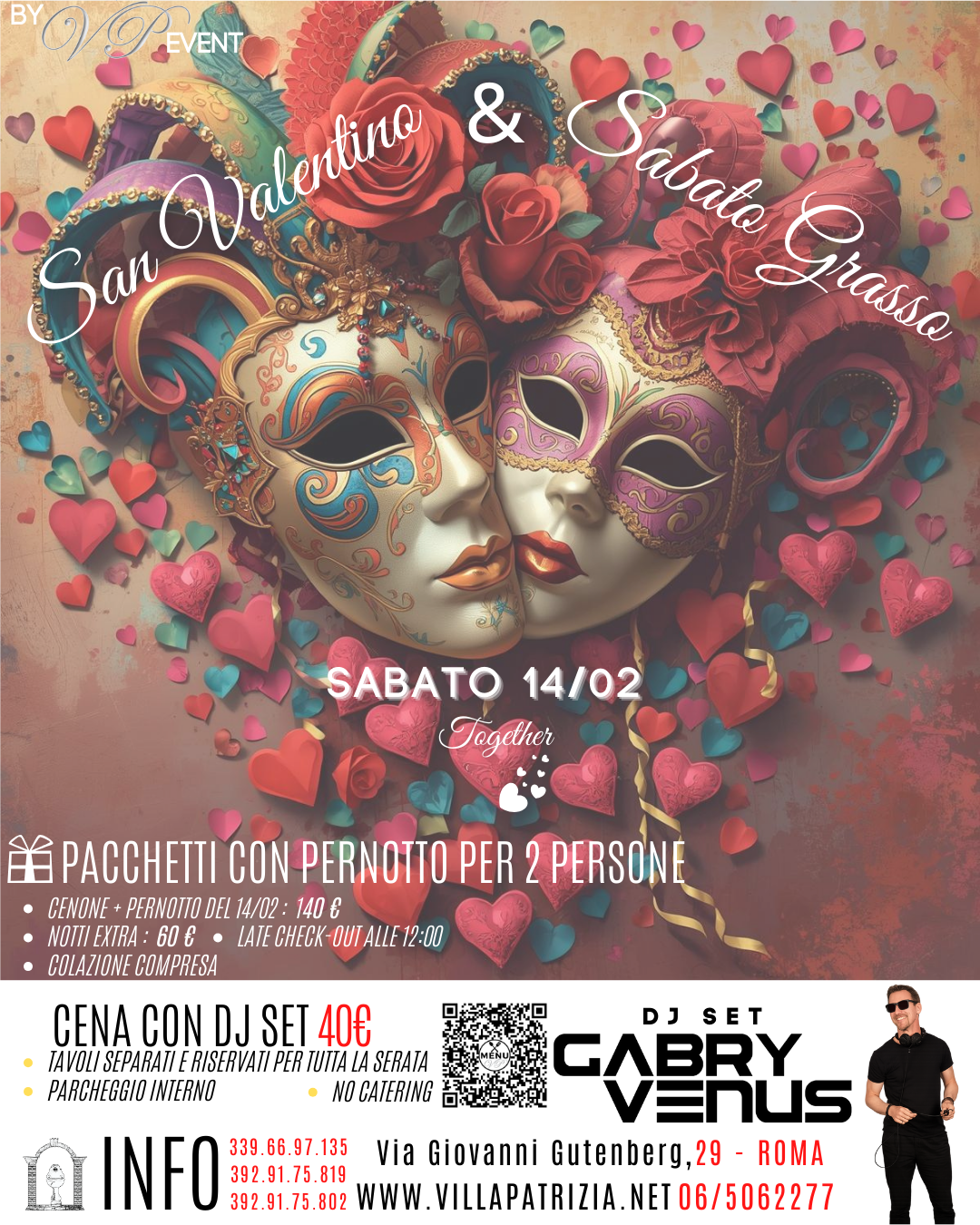 DINNER - DJ SET - MASK AWARDS - OVERNIGHT STAY - On February 14th, TAKE THE OPPORTUNITY TO CELEBRATE 2 EVENTS IN ONE WITH US! VALENTINE'S DAY & FAT SATURDAY - Dinner with DJ SET - AWARDS FOR THE BEST MASK and Overnight Stay - MASK AWARDS: (CREDIT prizes redeemable at Villa Patrizia during Events or Future Reservations in the Restaurant or Residence) - SINGLE MASK: €30 credit - COUPLE MASK: €50 credit - GROUP MASK (Minimum 6 people): €100 credit